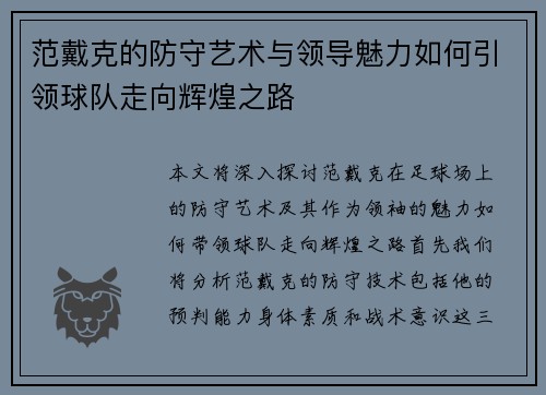 范戴克的防守艺术与领导魅力如何引领球队走向辉煌之路